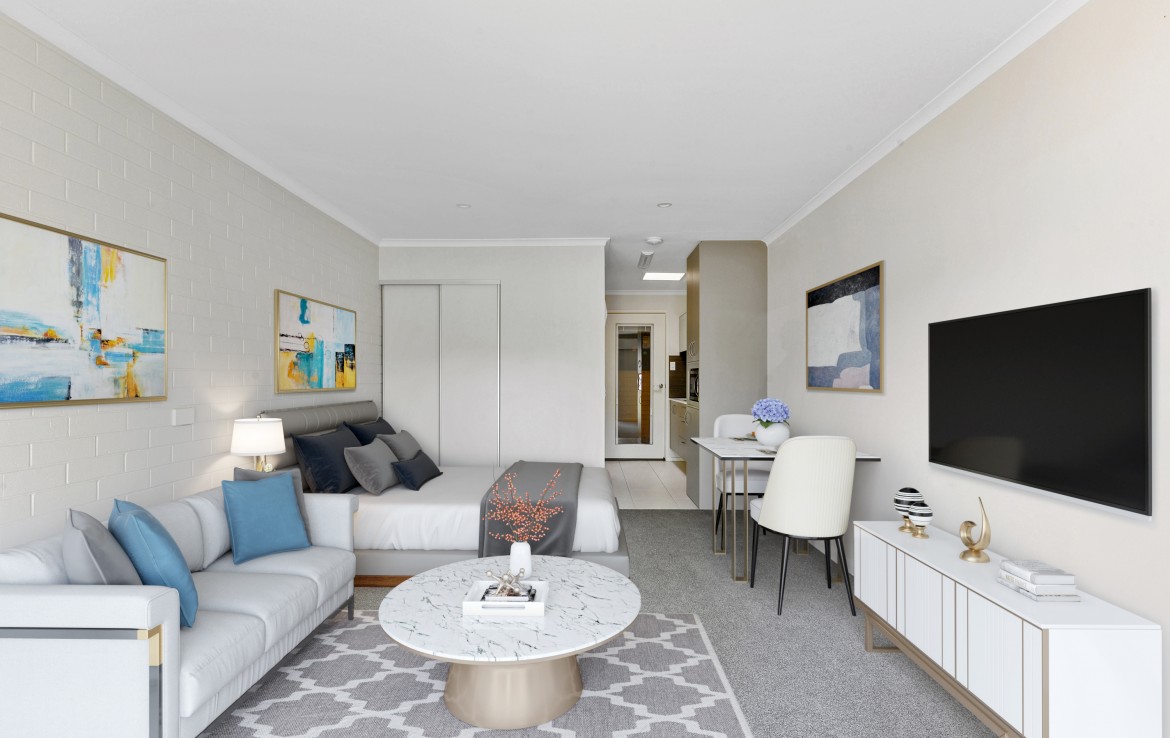 This gem presents a stylish floor plan featuring a bed-sit including built-in robes accompanied by block-out blinds and a reverse cycle air conditioner